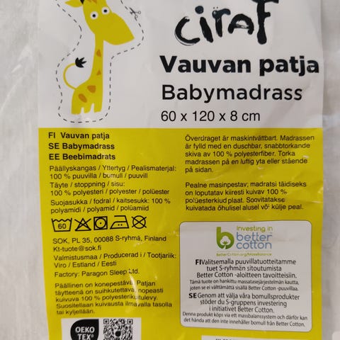 Kaxholmens patja vauvan sänkyyn, patjan mitat 40x90x5cm. Avaamaton paketti. Oli varalla, mutta ei tullut tarvetta, joten jäi käyttämättömäksi.