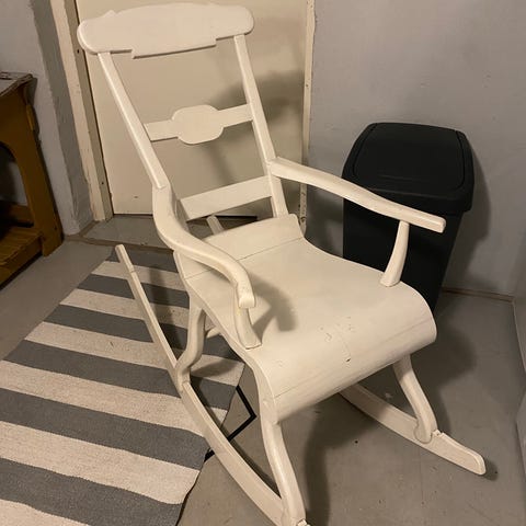 Valkoiseksi maalattu keinutuoli