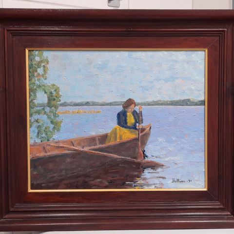 Öljyvärimaalaus kovapinnalle, jossa on kuvattuna järvimaisema veneineen ja puineen. Signeeraus J(i?). Sorvali.Kehyksissä on havaittavissa kulumaa ja halkeamia. Maalaus itsessään on hyvässä kunnossa.
