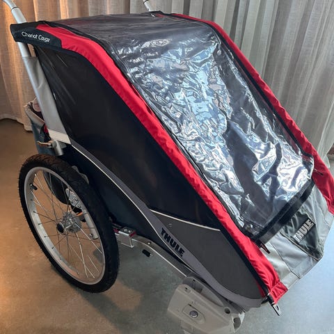 Thule Chariot Cheetah XT pyöräkärry kahdelle lapselle. Toimii pyöräkärrynä tai rattaina. Lisävarusteina voi ostaa hiihto- ja juoksusettiä, niitä ei meillä ole. Työntöaisan saa säädettyä kahteen tasoon, ja pyöräkärryn saa laitettua kasaan jos tarvitsee säilyttää pienemmässä tilassa. Jotkin kuminauhat löystyneet, toimivat silti. Tästä erittäin hyvä ja kevyesti rullaava kärry seuraaville!