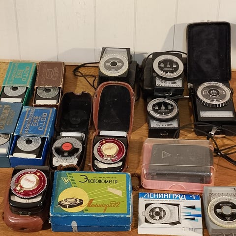 Neuvostoliittolainen valotusmittari. En tiedä toimiiko, kun en omista oikeita pattereita.