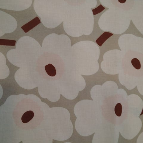 Marimekko Unikko kangaspala keltaharmaissa ja valkoisissa sävyissä. Koko 3 metriä x 70cm. Ei reunatekstejä. Kuvassa kaksinkerroin. Käyttämätön siisti pala.