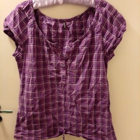 Lyhyt, leveähkö hihainen pehmoinen paita. Liilansininen. Oikein hyväkuntoinen. Koko M. Joustaa.