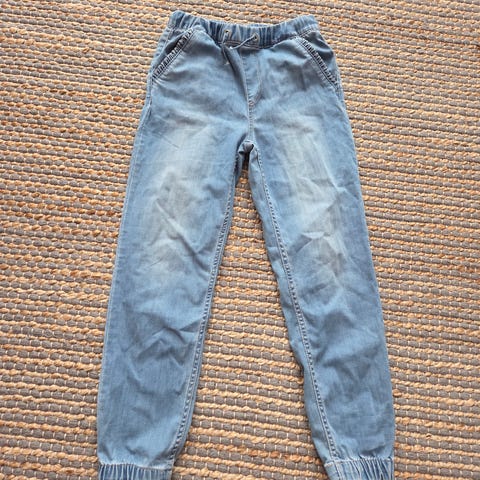 Kahdet H&M pull-on joggerit, koko 134. Paljon käytetyt, mutta ihan siistit edelleen. Vihreissä housuissa reidessä pieni reikä ja pieniä tahroja. Polvissa myös aavistus pehmentymää. Hajusteeton, savuton ja eläimetön koti. Mmm.