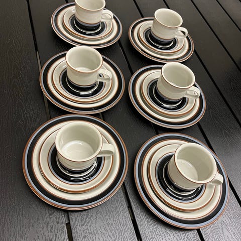 Myydään hyväkuntoinen 6kpl astiasto Arabian Taika-sarjaa. Sis 6kpl kuppia, 6kpl tassia ja 6kpl pullalautasta.