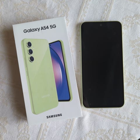 Samsung Galaxy A54 5G älypuhelin, tallennustila 128 GB. Kuvissa näkyy puhelin, myyntipakkaus sekä USB-C-kaapeli.