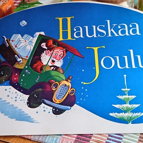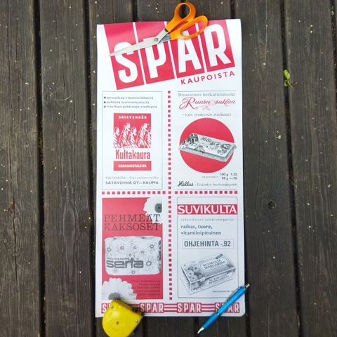 Ostan oheisen kuvan kaltaisia suurikokoisia kauppojen pahvimainoksia, kahvi- ym. aiheet ja tuotteet.