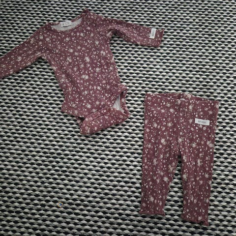 -vaaleanpunainen body ja housut, käännettävät hihansuut. Pinnassa on vaaleaa värjäytymää sekä bodyssä että housuissa, menevät hyvin vielä käytössä, mutta eivät ole enää siistit, nämä saa halutessaan kaupanpäälle.