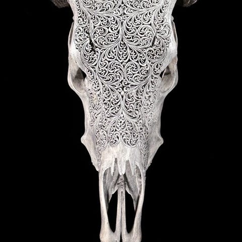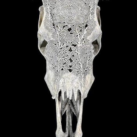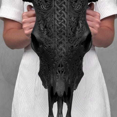 Ei minimihintaa - Upeamustaan musta käsin veistetty naudan pääkallo -