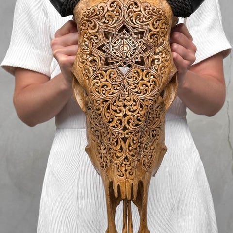 Käsin kaiverrettu lehmäkallo, jonka ovat kaivertaneet taiteilijat, jotka ovat siirtäneet muinaisen kaiverrustaidon isältä pojalle. Kallo on täysin käsin veistetty suurella huolella. Se on epätavallinen, koristeellinen kappale.Kaiverrus on kaunis ihmiskallomotiivi.Arvioidut mitatPituus: 54 cmLeveys: 41 cmVastuuvapautukset:Päähän on kiinnitetty kiristysnarusta, jotta se voidaan kiinnittää seinälle.- Sarvet irrotetaan kuljetusta varten, ja ne on helppo kiinnittää takaisin. Sarvet ovat aina pakattuna laatikon pohjalle, kallon alle. Varmista, että poistat sarvet ennen pakkauksen hävittämistä.- Koska kyseessä on luonnollinen kallo, siinä saattaa olla joitakin luonnollisia pieniä halkeamia, uurteita tai puuttuvia hampaita. Tämä on normaalia. Katso kuvat viitteeksi.- Kallomme puhdistetaan ammattilaisvoimin, mutta joskus hampaissa voi esiintyä pieniä värimuutoksia. Tämä on luonnollista ja normaalia, eikä siihen voida paljoa vaikuttaa. Katso kuvat ohjeiden tueksi.Olemme lisänneet kuvia käsityöläisistämme työssään antaaksemme kuvan siitä, millainen prosessi on kaiverratetun pään luominen.Mainittu paino sisältää pakkausmateriaalin.LähetyksetTuote lähetetään seurantanumerolla DHL Parcelin, DPD:n tai postNl:n kautta. Seuranta päivittyy Catawiki-luettelossasi, kun pakettisi on jätetty postiin.Tarkista säännöllisesti välttääksesi pakettisi palauttamisen meille, jolloin ostaja vastaa toisen lähetyksen toimituskuluista.-Espanjaan ja Portugaliin toimitettavaa seurantaa varten käytä tätä linkkiä ja lisää seurantanumero Catawiki-erästäsi.https://clientesparcel.dhl.es/LiveTracking/HomeME EMME YHDISTÄ TOIMITUKSIA!!!-Jos sinulla on kysyttävää lähetyksestäsi, ota meihin yhteyttä Catawiki-viestipalvelun kautta. Pyrimme vastaamaan kolmeen työpäivään kuluessa.