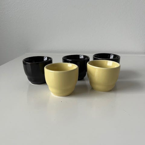 Kilta-lasitteella valmistetut HN-mallin munakupit. Kilta lasitteella valmistettiin myös ML- ja A/BA-mallin munakuppeja.
