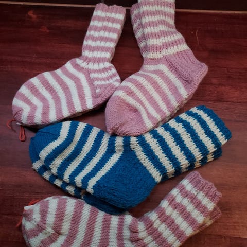 Vaaleanharmaat villasukat 7-veljestä-langasta kudottu. Varressa vohvelijoustin. Varren pituus 18,5cm ja terä 25cm. Koko 39. Pesu 40 asteessa.