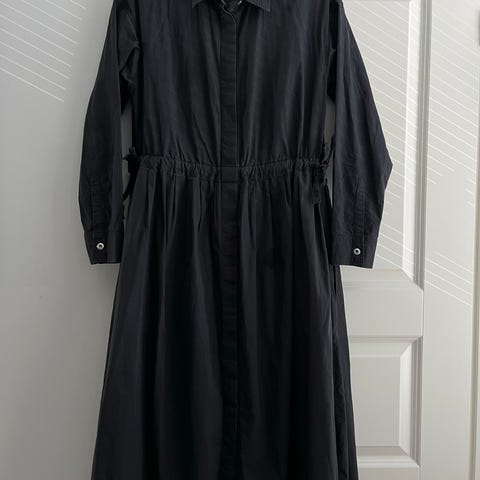 Marimekko arkimekko, koko 36. Sinisellä pohjalla vaalea geometrinen kuosikuvio. Materiaalina puuvilla. Mekossa on 3/4-pituiset hihat ja takana vyölenkit sekä kangasvyö metallisilla renkailla. Sopii arkipukeutumiseen ja kerrostettavaksi eri vuodenaikoina.