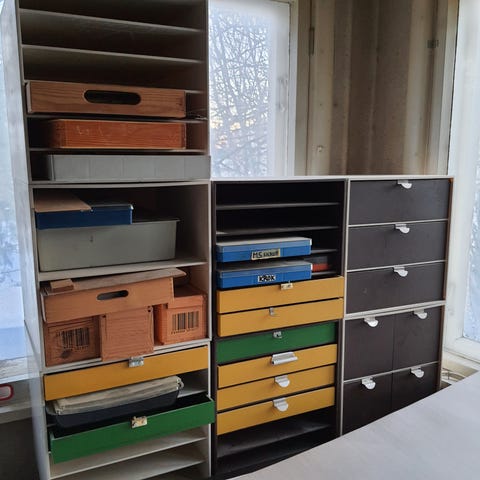 3 kpl ruskeita Palaset-lokerikkoja ja yksi sokkeli. Hyvä vintagekunto, jonkin verran käytön jälkiä, lähinnä naarmuja. Yleisilme mielestäni vielä siisti. Täydellisen kokoisia esim. viinylilevyjen säilytykseen.