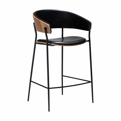 Crib-baarituolissa yhdistyy saumattomasti trendikäs 1950-luvun tyyli ja moderni muotokieli. Tuolissa on musta keinonahkaverhoilu ja selkänojaa koristaa tamminen viilupinta. Lisäksi pyöristetty selkänoja muuntuu kauniissa kaaressa käsinojiksi. Ohuet kartiomaiset metallijalat antavat tuolille kevyen viimeistelyn. Valmistajana tanskalainen Dan-Form.