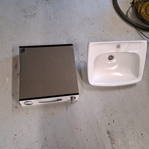 Allaskaapisto, allas ja hana. Voidaan myydä myös erikseen. Täyspuuta. Altaan pohjassa naarmuja. Ovissa pinttymää.