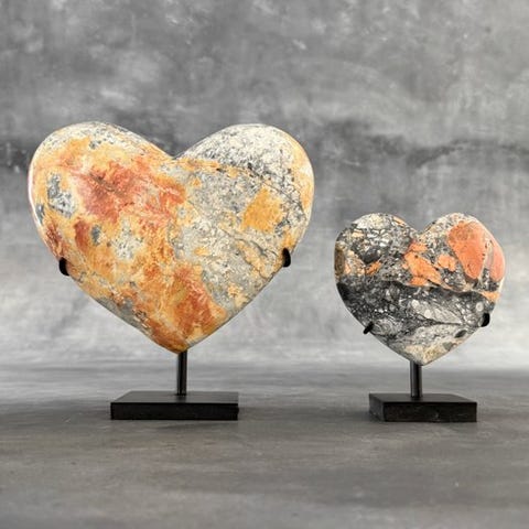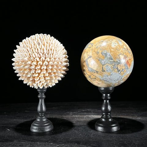 Upea pari kuoripalloa sekä punaisen Maligano-jaspiksen pallon, omilla räätälöidyillä jalustoillaan.Simpukankuorinen pallokoriste, näiden käsintehtyjen pallojen yksinkertaiset tekstuuriset muodot antavat luonnollisen ilmeen mihin tahansa tilaan. Koristeellinen, pallomainen pallo erikoisilla kuvioilla, joka on kokonaan päällystetty pienillä simpukoilla. Luonnollinen ja neutraali sävy, boho- ja ranta-tyylinen.Tämä lavasteiden koristelu on taidokkaasti käsintehty, käyttäen satoja pieniä merisiipimunia rosetteissa. Nämä on valmistettu sadoista luonnollisista simpukoista, jotka on käsin aseteltu, joten on normaalia löytää satunnaisesti puuttuva simpukka. Odota myös pieniä virheitä ja sävyeroja.Maligano jasper on tietty tyyppi jaspista, jota esiintyy Indonesiassa, ja se muodostuu muinaisten tulivuoren kuumavesilähteiden alueilla. Maligano tunnetaan kontrastisista lämpimistä sävyistään sinisten ja harmaiden sävyjen päällä, sekä upeista brecciated- eli rikkoutuneista ja parantuneista kuvioistaan, sekä hauskoista dendriittikuviostaan, jotka usein esittävät jokimaisemia pienten pensaiden kanssa vierivieressä solisevan joen äärellä.Noinmitat - mukaan lukien jalusta# Shell Ball : Korkeus: 23 cm - Halkaisija: 12 cm# Maligano Sphere : Korkeus: 19,2 cm - Ø: 10,5 cmVastuunvapaus- Tarkista paikallisilta määräyksiltä ja viranomaisilta, onko tämän tuotteen tuominen maahan sallittua, ennen tarjouksen tekemistä.Se on luonnontuote, pieniä halkeamia tai virheitä voi esiintyä. Ole hyvä ja katso kuvia.Ole hyvä ja huomaa, että nämä kuvat on otettu hämärässä studiosta, ja värit voivat vaihdella ympäristön mukaan.Yksi tai useampi kuva esittää tyyliteltyä esinettä. Tarkat tiedot myytävästä esineestä löytyvät muista kuvista. Tyylitellyssä kuvassa olevat esineet eivät sisälly myyntiin.Paino, joka mainitaan, sisältää pakkausmateriaalin.LähetysKohde lähetetään seurantanumerolla DHL Parcelin, DPD:n tai postNlin kautta. Seuranta päivittyy Catawiki-luettelossasi, kun pakettisi on jätetty postiin.Ole hyvä ja tarkista säännöllisesti välttääksesi pakettisi palautumisen meille, jolloin ostaja vastaa toisen lähetyksen toimituskuluista.Seurantaan Espanjaan ja Portugaliin käytä tätä linkkiä ja lisää Catawiki-erästäsi saatu seurantanumero.https://clientesparcel.dhl.es/LiveTracking/HomeEMME YHDISTÄ TOIMITUKSIA!!!- Jos sinulla on kysyttävää paketistasi, ota yhteyttä meihin Catawiki-viestipalvelun kautta. Yritämme vastata kolmen työpäivän kuluessa.