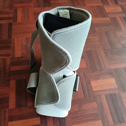 Ortopedinen kävelyortoosi nilkka- ja jalkatuki. Koko M, väri harmaa mustilla remmeillä. Tuki on säädettävissä tarrakiinnitteisillä remmeillä säären ja jalkaterän kohdalta. Pohjassa on kuvioitu kumipohja, joka parantaa pitoa kävellessä. Mukana erillisiä pehmusteita, joilla tukea voi muokata istuvammaksi. Soveltuu nilkan ja jalkaterän tukemiseen esimerkiksi vamman tai leikkauksen jälkeen lääkärin ohjeen mukaan.