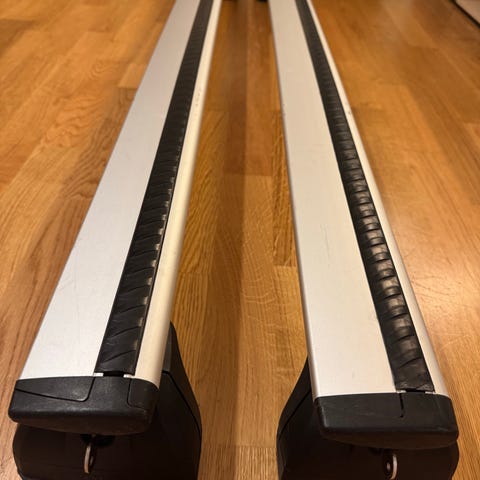 Volvon omat/alkuperäiset. Telineissä on alumiiniset, hopeanväriset poikittaisprofiilit ja mustat muoviset päädyt. Mukana tulee neljä avainta lukittavia päätyjä varten. Soveltuu auton kattokaiteisiin tai kiinnityspisteisiin.