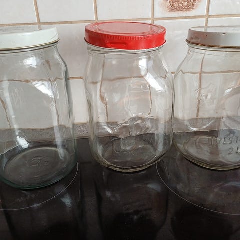 3 L ja 5 L lasipurkkeja.Toinen Riihimäki toinen Ilves.15 ja 10 e