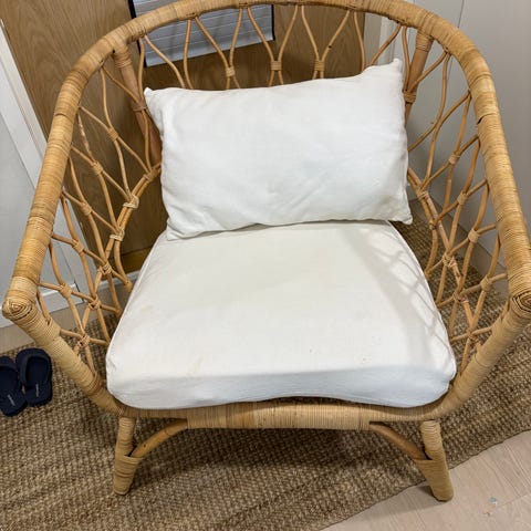 Valkoiseksi maalattu korituoli tai nojatuoli. Ihana suuri ja kuitenkin kevyt siirrellä. Koiratalous.
