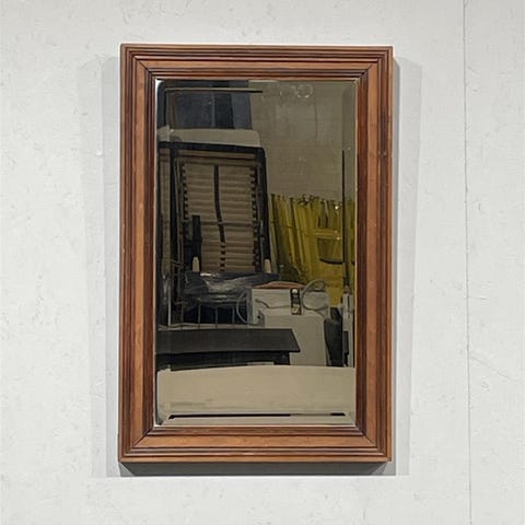 Vanha peili, jossa on puinen kehys. Kehyksen kulmat ovat viistot ja peilin pinta on hieman kulunut.
