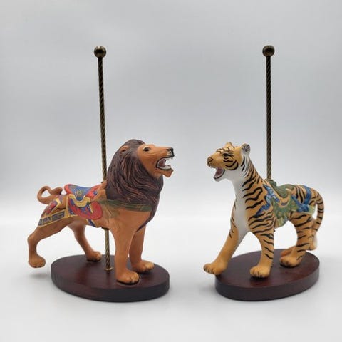 Upea kaksikappaleinen karusellifiguurien setti The Carousel Art -kokoelmasta Franklin Mintilta, valmistettu korkealaatuisesta posliinista ja käsin maalattu.Tämä kokonaisuus edustaa:Karusellikameli, rikkaasti valjastettu, orientaalisen tyylin koristeineen tarkasti yksityiskohtainen.Ilmeikkäästi muotoiltu karusellin vuohi, koristeltu kirkkailla väreillä ja kultaisilla yksityiskohdilla.Jokainen kappale on asennettu puiselle jalustalle, jonka keskellä on metallinen vartta, uskollisesti perinteisten karusellien estetiikalle.Kahdella figuurilla on Franklin Mint 1988 -merkintä, joka näkyy figuurien alta ja todistaa niiden aitouden sekä tuotantokauden.Veistoksen laatu on huomattavaa, ja siinä on tarkkaa työtä tekstuurien (turkki, satuloiden, koristeiden) parissa sekä huolellisesti toteutettu väritys, joka on tyypillistä Franklin Mintin huippuluokan tuotannoille 1980-luvun lopulla.Osavaltio:Erittäin hyvä yleiskunto.Ei rikkoutumista eikä korjausta.Kevyet käytön merkit tai patina ovat mahdollisia, ikä huomioiden.Kaikki valokuvat ja yksityiskohtainen kuvaus kertovat kohteen kunnosta.Monet valokuvat ovat olennainen osa myyntiä.Envoi:Huolellinen ja ammattimainen lähetys, jossa on seuranta.Franklin Mint, The Carousel Art, karuselli, karusellifiguuri, käsinmaalattu posliini, koristeellinen veistos, kokoelma 1988, sisustukseen, näyttelyesine, Ystävänpäivän lahja, vintage-koristeellinen taide.Hyviä huutoja Catawiki:ssa!!!