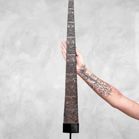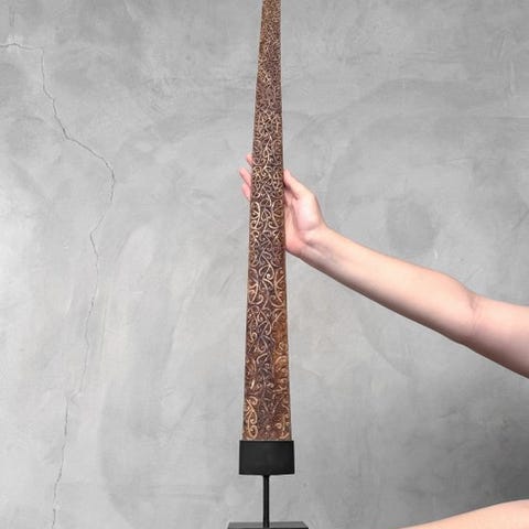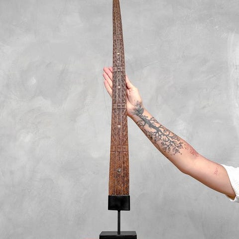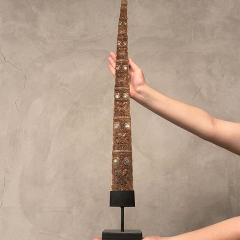 Extra suuri käsin veistetty miekkakala-hammas, jossa on perinteinen Maori Wheku ja Tiki veistos. Wheku, joka tarkoittaa 'veistettyä kasvoa', kuvaa esi-isän kasvoja. Wheku sijaitsee yleensä Wharenuin, Maori-kokoushuoneen, harjan huipulla ja symboloi tärkeää esi-isää, jonka mukaan talo on nimetty. Tämän maorin silmät on koristeltu abalone-kalalla, mikä lisää vaikuttavaa yksityiskohtaa ja kunnioittaa maorin perinteitä.Lue lisää tästä veistoksesta alla olevasta linkistä:http://teaohou.natlib.govt.nz/journals/teaohou/issue/Mao29TeA/c18.htmlARVIOITU MITTA jalusta mukaan lukienKorkeus jalustan kanssa: 87 cmVastuunrajoitukset- Koska kyseessä on luonnollinen syöksyhammas, siinä saattaa olla pieniä luonnollisia halkeamia ja rakoja. Tämä on normaalia. Katso kuvia.- Syöksyhampaat puhdistetaan ammattimaisesti, mutta joskus pieniä värimuutoksia esiintyy silti. Tämä on luonnollista ja normaalia, emmekä voi tehdä asialle paljoakaan. Katso kuvia.Yksi tai useampi kuva esittää tyyliteltyä esinettä. Tarkat tiedot myytävästä esineestä löytyvät muista kuvista. Tyylitellyssä kuvassa olevat esineet eivät sisälly myyntiin.Mainittu paino sisältää pakkausmateriaalin.LähetysKohde lähetetään seurantanumerolla DHL Parcelin, DPD:n tai postNlin kautta. Seuranta päivittyy Catawiki-luettelossasi, kun pakettisi on jätetty postiin.Ole hyvä ja tarkista säännöllisesti välttääksesi pakettisi palautumisen meille, jolloin ostaja vastaa toisen lähetyksen toimituskuluista.Seurantaan Espanjaan ja Portugaliin käytä tätä linkkiä ja lisää Catawiki-erästäsi saatu seurantanumero.https://clientesparcel.dhl.es/LiveTracking/HomeME EMME YHDISTÄ TOIMITUKSIA!!!Jos sinulla on kysyttävää paketistasi, ota meihin yhteyttä Catawiki-viestipalvelun kautta. Pyrimme vastaamaan kolmessa työpäivässä.