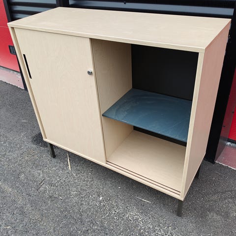 Toimistokaappi kolmella ovella ja avohyllyköllä. Pieniä kolhuja. Harrastetilaan tai Autotalliin aarteiden säilömiseen. Korkea kaappi voidaan irrottaa kuljetuksen ajaksi.