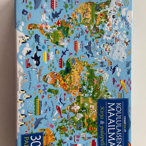 Palapeli, jossa 100 palaa. Palapelissä on värikäs maailmankartan kuvitus, jossa näkyy eri mantereita, eläimiä ja merieläimiä. Pakkauksena on kantokahvalla varustettu laatikko, joka helpottaa säilytystä ja kuljettamist