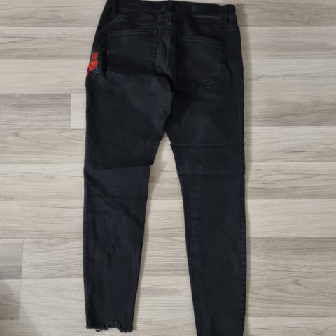 Mustat HALOSEN joustavat farkut. Suorat lahkeet. Materiaali 79 % puuvillaa, 19 % polyesteri ja 2 % elastaani. Olleet vähäisellä käytöllä. Vyötärö 80, lahkeen sisäpituus 74 ja housujen kokopituus edestä 102 cm.