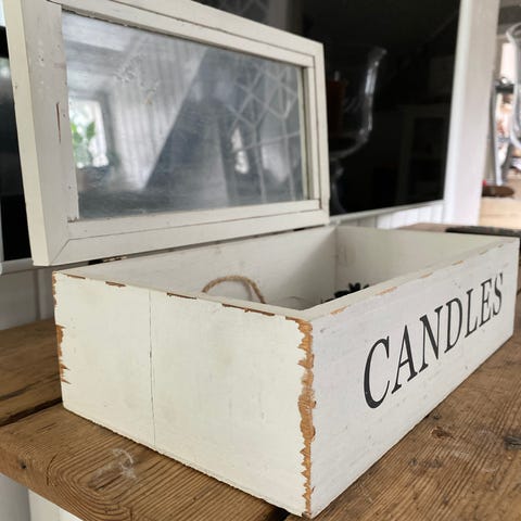 Posliini kynttelikkö ja iso laatikko kynttilöitä