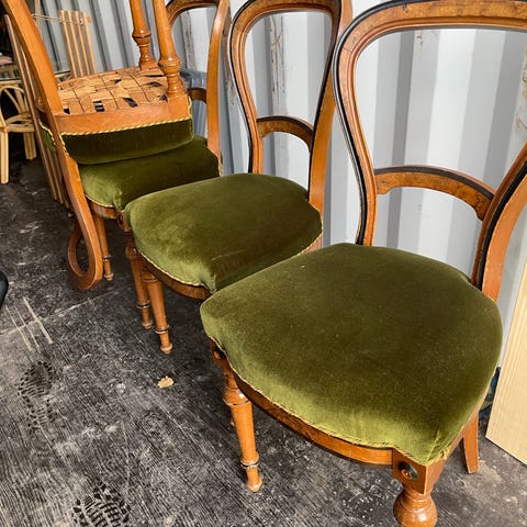 Hyvässä kunnossa olevat tuolit joissa päälysteet ja puu-osat kunnossa. Pientä käytön jälkeä vanhoissa tuoleissa tietenkin löytyy mutta ei mitään korjausta vaativaa. Molemmat tuolit yhteishintaan 150€. Tuolin mitat korkeus 89cm leveys 57cm syvyys 59cm istumakorkeus 48cm. Kuvassa oleva konjakkikaappi ei ole myytävänä. Nouto Tuusula Jokela.