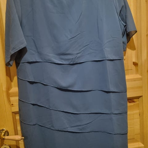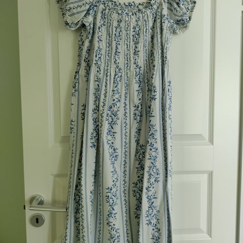 Kesämekko, koko 3XL. Valkoinen puuvillamekko, jossa sininen kukkakuviointi. Lyhyet hihat ja hieman levenevä helma. Sopii arkeen ja vapaa-aikaan lämpimään säähän.