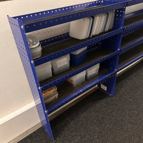 Metallinen hylly pakettiautoon. 2 päätyä ja kolme hyllyä sekä purkkiteline päätyyn. Leveys 129cm, korkeus 121cm ja syvyys 33cm.