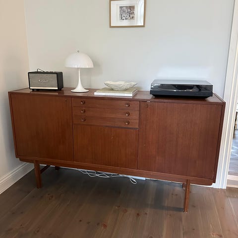 Myydään ruotsalainen Hugo Troeds Bjärnum teak sideboard senkki 1960-luvulta. Tämä on erinomaisessa kunnossa ja siihen kuuluu vetolaatikot ja säädettävät hyllytasot. Avain on tallessa ja kaikki toimii. Tuotteella on mustat kahvat ja jalat.