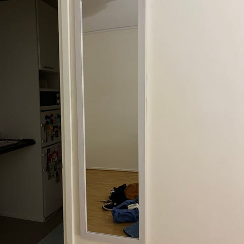 IKEA kokovartalopeili, jossa musta suorakulmainen kehys. Peili soveltuu esimerkiksi makuuhuoneeseen tai eteiseen ja voidaan asettaa lattialle seinää vasten tai kiinnittää seinään mallista riippuen. Musta kehys tuo selkeän ja pelkistetyn ilmeen sisustukseen.
