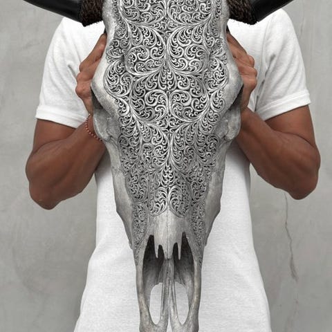 Suuri käsin kaiverrettu härän pää, jonka ovat kaivertaneet taiteilijat, jotka ovat siirtäneet muinaisen kaiverrustaidon isältä pojalle.Kallo on kokonaan käsin veistetty suurella huolella. Se on epätavallinen koriste-esine.Kaiverrettu on kaunis tähtimandala-motiivi.Arvioidut mitatKorkeus: 55 cmLeveys: 63 cmHUOM.Olemme lisänneet kuvia käsityöläisistämme työssään antaaksemme kuvan siitä, millainen prosessi on kaiverratetun pään luominen.Paino, joka mainitaan, sisältää pakkausmateriaalin.VastuunvapausPäähän on kiinnitetty kiristysnarusta, jotta se voidaan kiinnittää seinälle.- Sarvet irrotetaan kuljetusta varten, ja ne on helppo kiinnittää takaisin. Sarvet ovat aina pakattuna laatikon pohjalle, kallon alle. Varmista, että poistat sarvet ennen pakkauksen hävittämistä.- Koska kyseessä on luonnollinen kallo, siinä saattaa olla joitakin luonnollisia pieniä halkeamia, uurteita tai puuttuvia hampaita. Tämä on normaalia. Katso kuvat viitteeksi.- Kallomme puhdistetaan ammattilaisvoimin, mutta joskus hampaissa voi esiintyä pieniä värimuutoksia. Tämä on luonnollista ja normaalia, eikä siihen voida paljoa vaikuttaa. Katso kuvat ohjeiden tueksi.LähetysKohde lähetetään seurantanumerolla DHL Parcelin, DPD:n tai postNlin kautta. Seuranta päivittyy Catawiki-luettelossasi, kun pakettisi on jätetty postiin.Ole hyvä ja tarkista säännöllisesti välttääksesi pakettisi palautumisen meille, jolloin ostaja vastaa toisen lähetyksen toimituskuluista.Seurantaan Espanjaan ja Portugaliin käytä tätä linkkiä ja lisää Catawiki-erästäsi saatu seurantanumero.https://clientesparcel.dhl.es/LiveTracking/HomeME EMME YHDISTÄ TOIMITUKSIA!!!Jos sinulla on kysyttävää paketistasi, ota meihin yhteyttä Catawiki-viestipalvelun kautta. Pyrimme vastaamaan kolmessa työpäivässä.