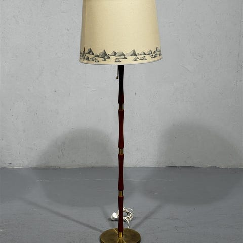 Kaunis lattiavalaisin -60 luvulta. Runko messinkiä ja puuta. Hienot yksityiskohdat. Varjostin hyvässä kunnossa sävy valkoinen-beige.