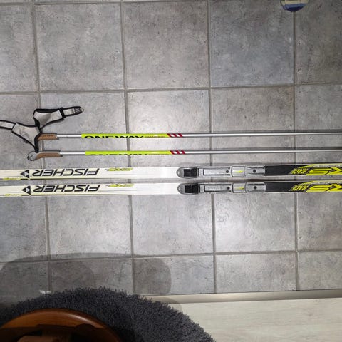Sukset: Fischer SC skate classic 167cm Salomon SNS Profil siteillä. Sopivat noin 40-50kg ja 140-150cm hiihtäjälle. Muutamia naarmuja pohjissa.