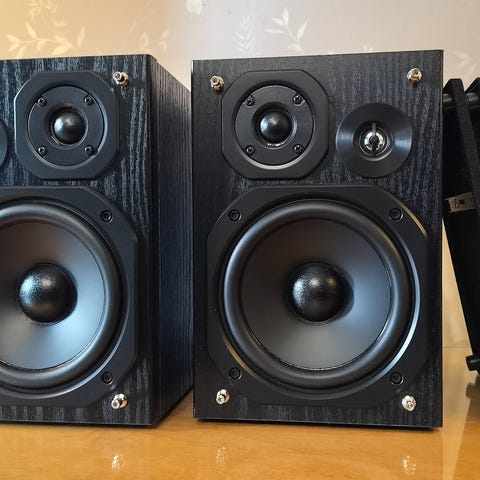 Elementeiltään ehjät ja kivasti soivat kaiuttimet, toisessa pintakalvo revennyt ja kulmissakin pikku ruhjeita.. kotelot kuitenkin ehjät. Toisessa etuverkossa reikä, näkyy kuvassa.