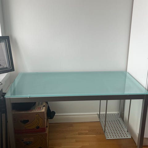 Metallirunkoinen pöytä lasikannella. Lasikannessa on naarmuja mutta yleiskunto on hyvä. Nouto Kalliosta