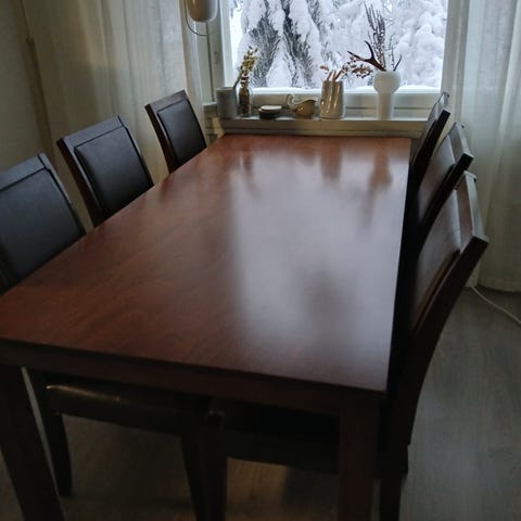 Laitalan talonpoikaisrokokoo jatkettava ruokapöytä, kuvassa 1 jatkopala, toinen lisättävissä. Pöydän pinnassa 1 pieni vaalentuma, muuten virheetön. Tuolit täysin virheettömät ja puhtaat.