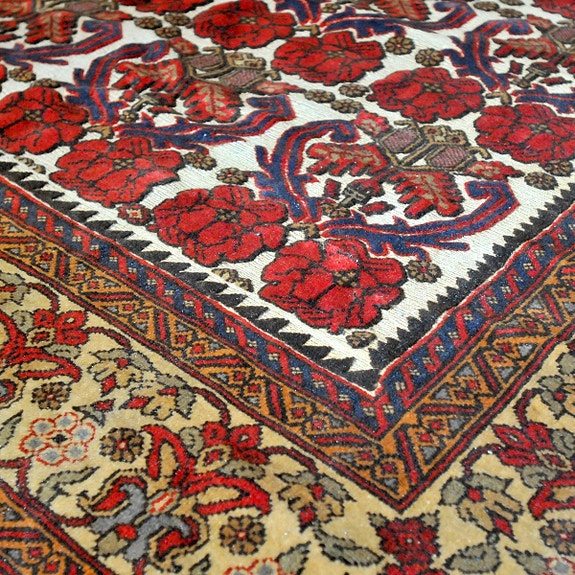 Kunto: Ehjä ja tahraton. Vain vähäistä käyttökulumaa. Toisen reunan kierteitä uusittu. Hapsut kuluneet paikoin lyhyiksi.