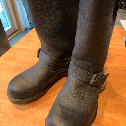 Teräskengät, 20 rengasreikää, nahkainen kärki, karkaistu kumipohja, kolmoisompeleet, teräskärki, fleecepohja. Kengän korkeus 39 cm, pohjan korkeus kantapäästä 3,72 cm, pohjan korkeus kärjestä 2,41 cm.