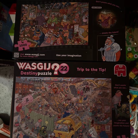 Wasgij Back To 1 1000 palaa. Huom 1 pala puuttuu. Palat pussitettu. Laatikossa pientä kulumaa ja vähän teippiä laatikossa. Kannesta vähän painunut. Mutta muuten ehjä.