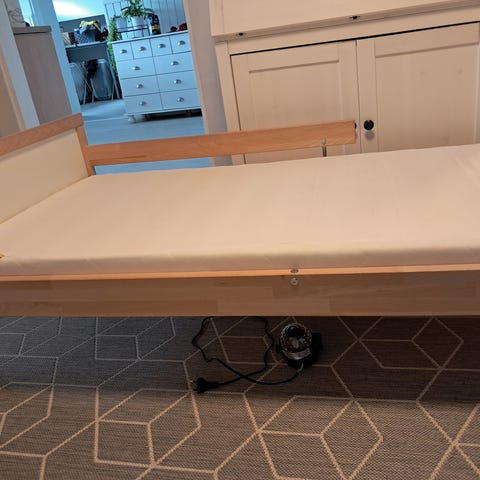 Suoraan käytöstä. Ostettu uutena, ollut käytössä 5 vuotta. Nyt isomman sängyn tieltä pois.