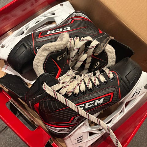 CCM lasten jääkiekkoluistimet, koko 37. Väri musta–valkoinen–sininen. Luistimissa perinteinen nauhakiinnitys ja teräkisko jääkiekkokäyttöön. Soveltuvat lasten ja nuorten jääkiekkoharjoitteluun ja luisteluun jäähalleissa tai ulkokentillä.