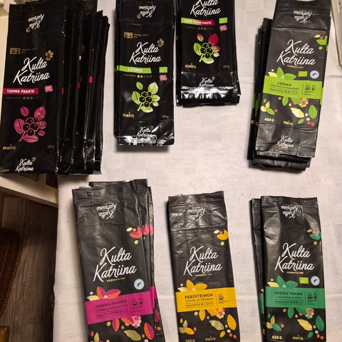 Kuvan kassillinen (tiukkaan pakattu) erilaisia kahvipusseja. En ole laskenut määrää mutta paljon, painoa n. 1,5kg