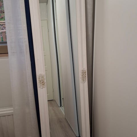 Siisti peili valkoisilla puisilla kehyksillä. Peiliä voi pitää maassa tai ripustaa seinälle. Mitata ovat 152x68cm